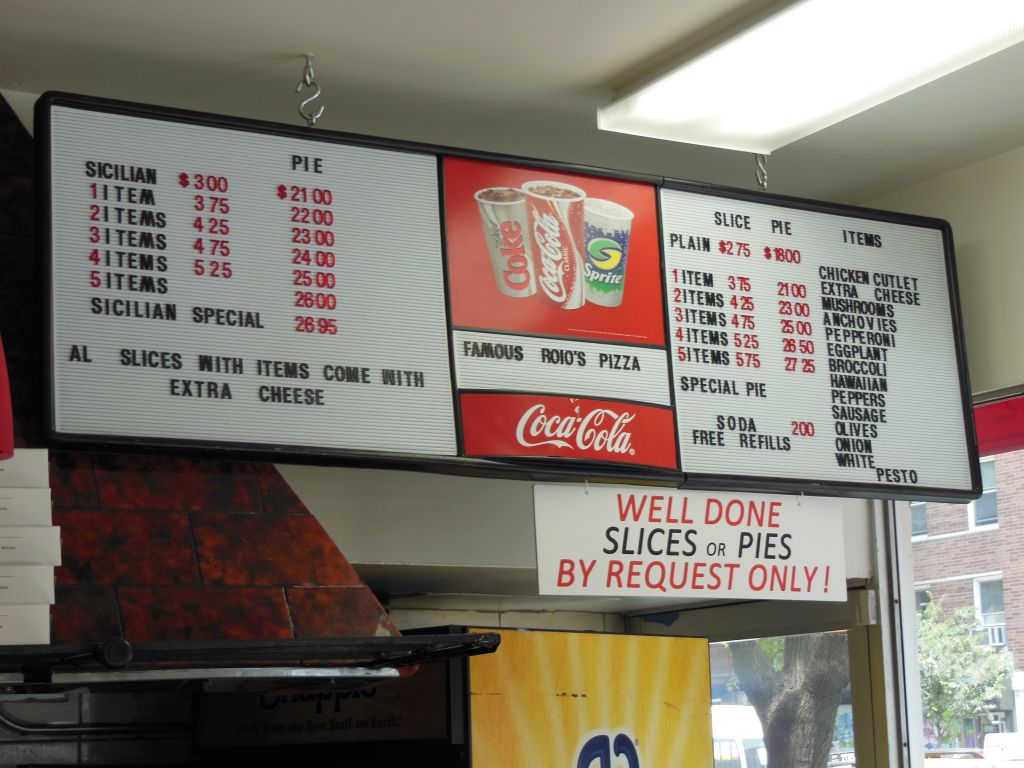 The “Inflation Calculator” (I love the internet!) tells me that $0.25 cents in 1969 would be $1.47 in 2010, so it looks like the price of a slice seems to be out-running inflation. Slices in New York City now seem to be going for $2.75 (Roios’s prices are pictured below) and are about $2.00 in Bayonne and $2.25 here in Music City. What are slices going for in your neck of the woods?