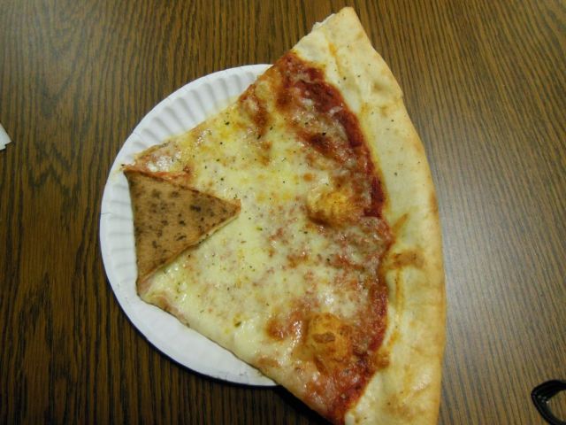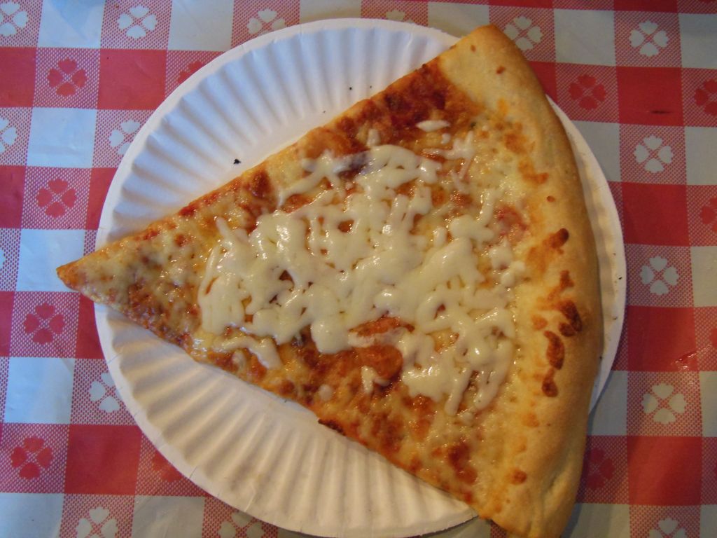 Our disappointment started with having to not only be seated to order a slice through a waitress, but to then have to wait 30 minutes for it, even though the slices we ate were sitting there in the counter when we arrived! The slice itself was oversized (a bargain for only $3.35) but was so thin that the point was actually flapped over when placed in front of me. The cheese was odd and a bit plastic-like with no run in it whatsoever. There also wasn’t much taste to the sauce but the crust was cooked rather well on the bottom. I had noticed during my wait that several customers were leaving their crust and I soon understood why. There was way too much crust at the end and it was so chewy that my jaw actually hurt from chewing it all down. Despite being disappointed, in a way the slice was somewhat tasty not making this a total waste of my time. But then again it could have just been my late night hunger.