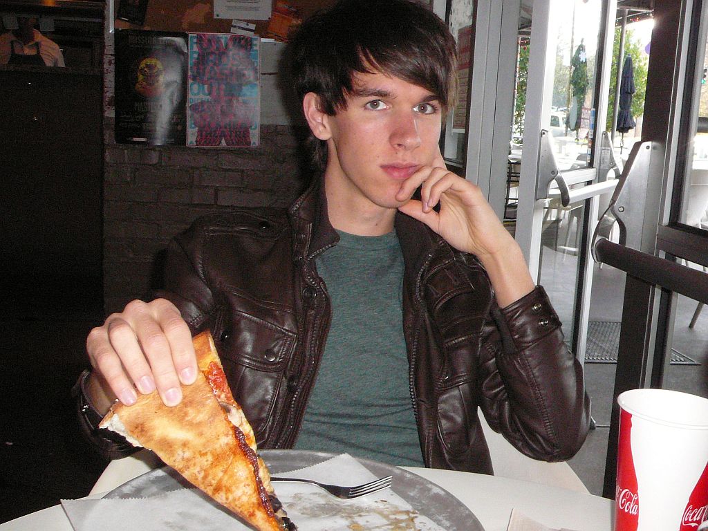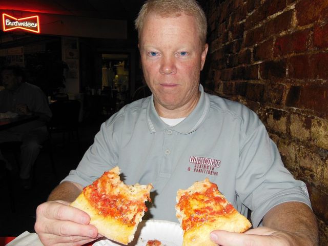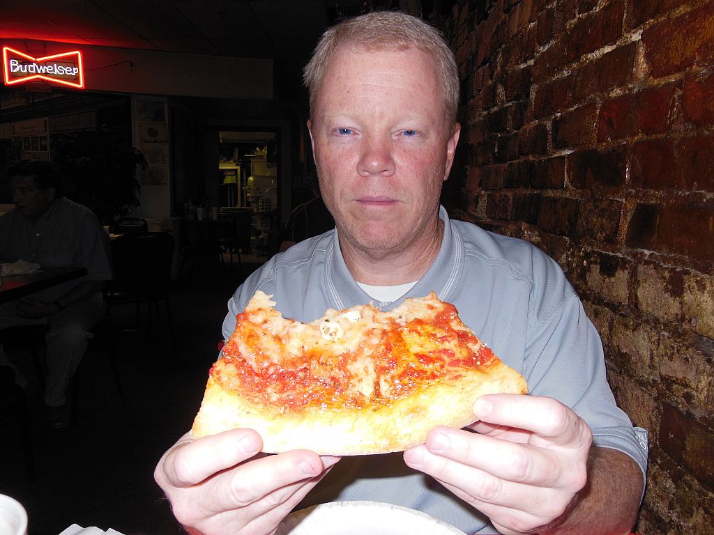 But I would like to close out this piece by showing you a classic eating move that I have developed over the years. I call it the “Rip.” So, you are eating a slice down from the top the way one obviously should. But due to its triangle shape, it is of course thinner at the top than at the bottom, and as a result, at some point, you will find yourself in this spot, as illustrated by fellow pizza-lover, baseball fan and 10-K runner, Mr. Mark.