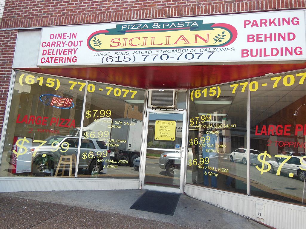 You know what I’m talking about. That little round “personal” pizza that is puffy because it has way too much cheese and dough. It’s light and fluffy and also undercooked because it wasn’t made in a conventional pizza oven. The cheese doesn’t cling to the oversized crust and it also has those light brown toast marks on top that can taste rather funky. The puffy pie is known to appear in school or hospital cafeterias, gas stations and other places where you shouldn’t be eating pizza in the first place. Well I recently encountered one here in Music City at Sicilian Pizza & Pasta. Here’s how it looked.