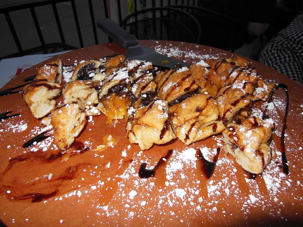 Monty and I arrived around dinner time and were seated on Joe’s outside patio. We were warmly greeted with a tasty complimentary appetizer of fried green beans. As Joe doesn’t do slices, we opted for a small cheese pie that was somehow upgraded to a large just as Joe himself showed up at our table. He had been on the watch for me after I made the compromising blunder of telling him I was coming. The potential awkwardness of a bad review abated as soon as we dived into his wonderful pizza creation.