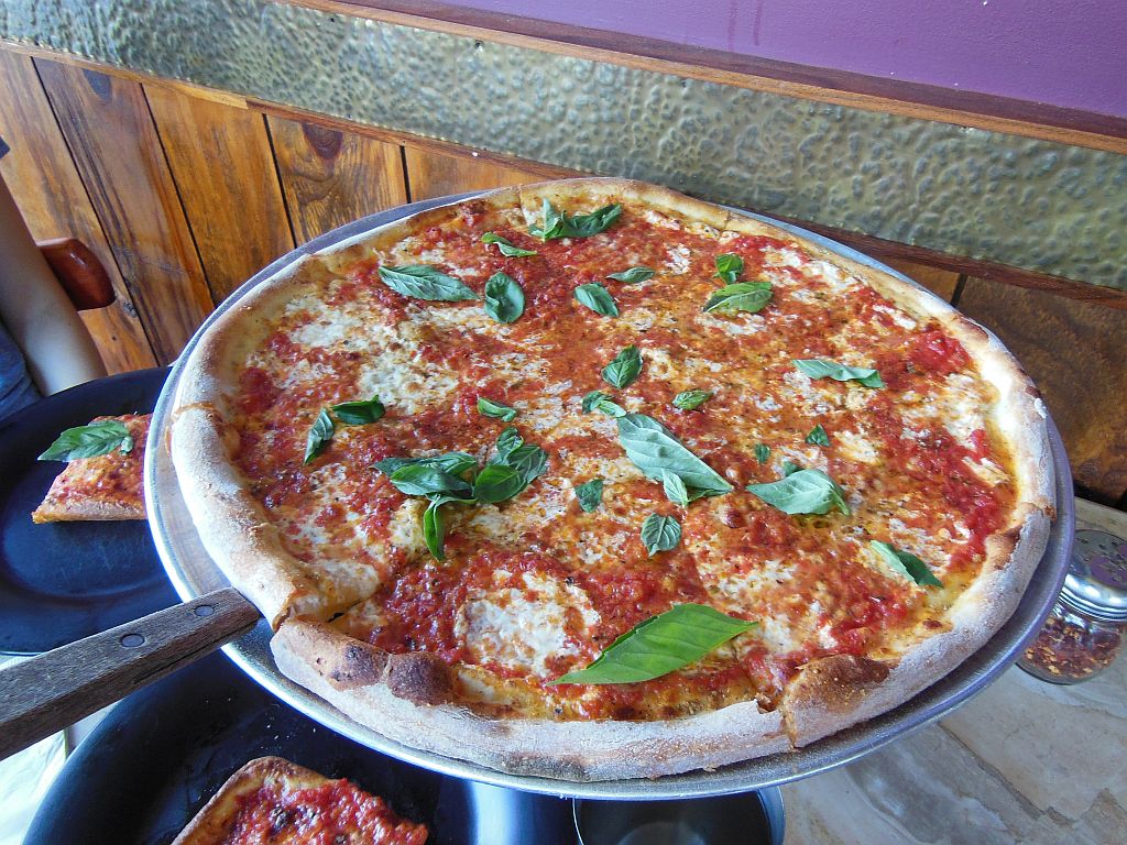 Like Grimaldi’s, Ignazio’s pizza is margherita-style with a “no slices and no credit cards” policy. We opted to try both of their signature pies: the “Pizza,” or round, and the “Siciliana,” or square. The latter pie is simply a square one with thicker crust. Now, this isn’t a margherita pizza like you’d get at California Pizza Kitchen. This is the real deal as was originally created back in Italy. Made thin and cooked crispy like New York style, this pie has sliced mozzarella as opposed to shredded–with a touch of Pecorino Romano. The sauce is made from plum tomatoes and spiced with basil. (I must insert here that I started off with a chicken Caesar salad that may have had the best smoked chicken I have ever eaten.)