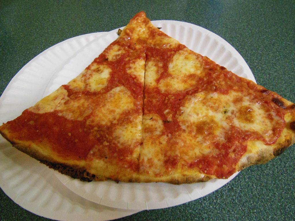 After an hour of baseball – I had seen two full innings, nine runs and five errors–it was time for me to eat, so I headed further south on the island to Joe and Pat’s, self-described as “Staten Island’s Thin Crispy Crust Pizza.” This place is a walk-up slice joint with an adjoining room that serves as a full-menu restaurant. I walked up to the counter and ordered a pair of $2.00 slices.