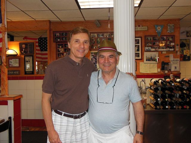 Earlier that week I had to stop my over-zealous Dad from outing me as the Snob to Luciano, the proprietor of this fine establishment (Luciano and I are pictured below). Glancing at the counter I was immediately impressed by the respect for pizza it exhibited. Waiting there to be fired up by the slice were three pies: a round, a square – cheese, of course, and a second round that was half sausage and half pepperoni. It’s almost as if that counter was saying “Fu-fu pizza eaters stay away!”