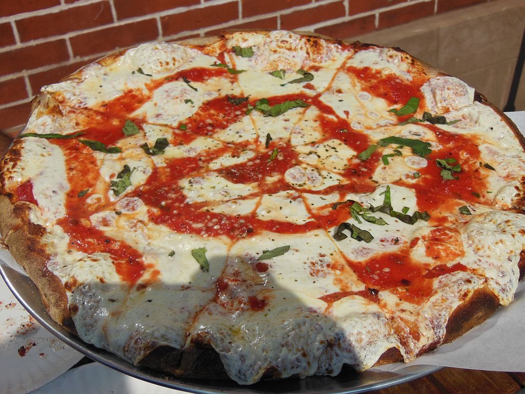 The place is just a short walk from the Essex Street stop on the Light Rail, and I arrived to find it no more than just a hole in the wall – albeit a nice one. It is nothing more than a small space cut out of the side of a red brick condominium building. Judging by the scant seating inside, I suspect this is a popular take-out place for this condo-heavy area of the city. Fortunately, there were several spacious tables out front which were perfect for that sunny, pleasant day. The gang arrived and without any further input quickly nominated me to do the ordering. Everything was Margherita-style, so I selected the Regular and another that they dubbed “Sicilian Style.”