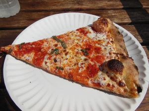 Well, my afternoon couldn’t have been better! Not only did I have a blast revisiting old times with old friends, but the pizza was fabulous! It didn’t quite match the flavor extravaganza that I recently experienced at Ignazio’s in Brooklyn, but the Paulus Hook pie was delicious. Made with fine, fresh ingredients, it was cooked just right -toasted nicely, blackened on the bottom, and firm enough to hold, fold and crunch. As for the two different types of pies we tried, the Sicilian (round, not square as I expected) seemed to offer extra cheese but not the typical thicker crust. I say, stick with the Regular -you won’t be disappointed. The Regular slice is pictured below on the left, the Sicilian pie on the right. The five of us had no trouble knocking off the two large pies, and we all agreed that Paulus Hook Brick Oven Pizza was a hit!