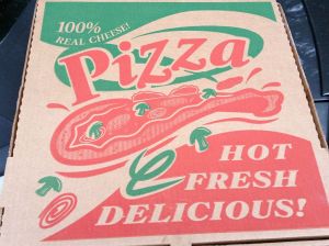 Whole Foods does a great pizza business. They have a nifty process whereby they use bar-coded triangular take-out boxes (pictured below) for their $2.49 each slices. While they prominently display plain cheese and pepperoni, they also have “gourmet” choices of pineapple, goat cheese, and ad nauseum.