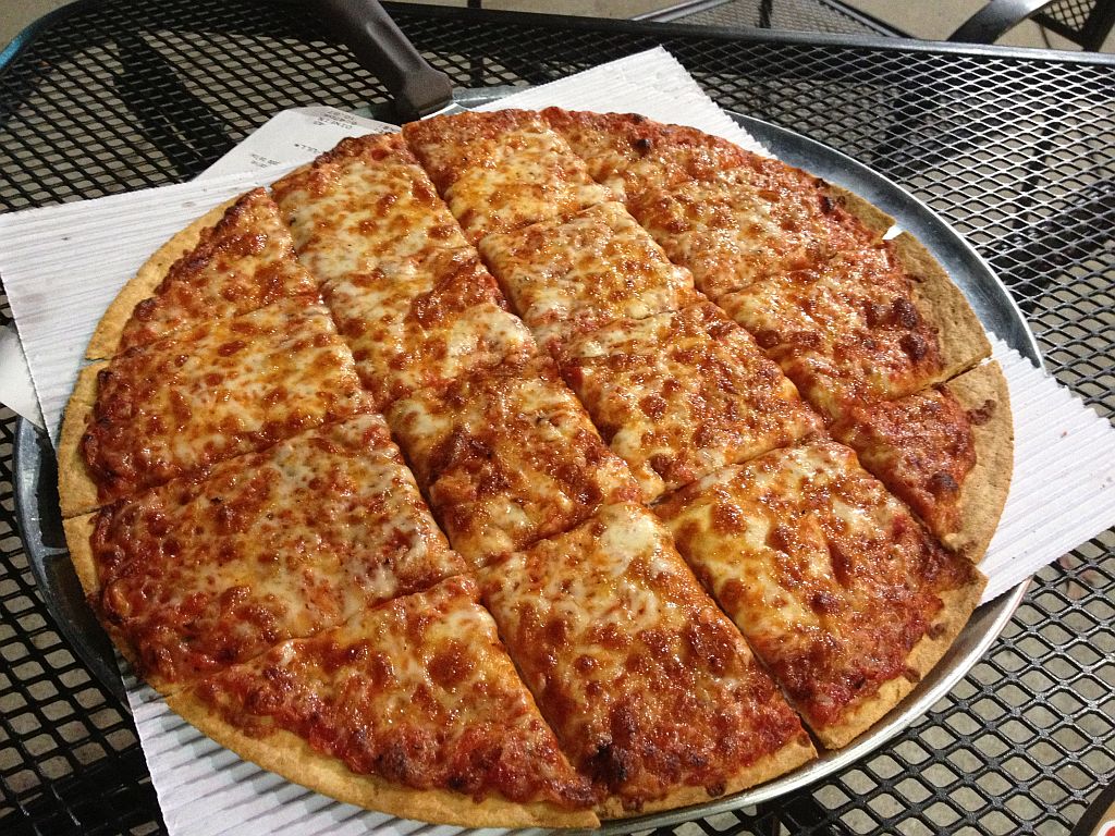 On a warm fall evening, my son, The Philosopher, and I found that we were on our own for dinner. Looking for adventure as well as a future story to write, we hopped on our bikes and headed over to Marco’s for a pie. The look of Marco’s “Classic” pie wasn’t appealing to the Snob. It was too thick and doughy, a pie meant more for toppings abusers than for an NY-pie traditionalist like me. We, therefore, ordered my old standby, a $9.95 large, “Crispy Thin,” cheese pie.
