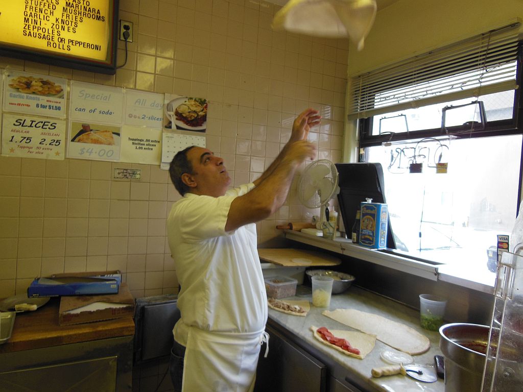 My final “eating” stop this morning was further up Broadway at a spot I had never before visited, Mario’s Pizza. I started out having to out myself as the Pizza Snob after the owner caught me snapping a picture of his place from across the street. Despite subjecting myself to possible favoritism, I enjoyed chatting with the friendly owner (not the original Mario) who happily posed for some pizza-tossing photos. Along with my $1.75 cheese slice fresh out of the oven, he treated me to a sliver of his special Sicilian pie.