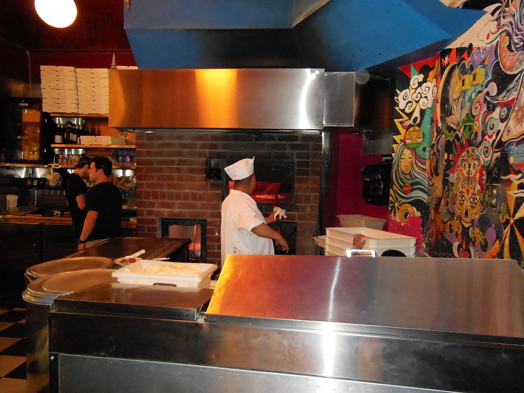 John’s has two adjoining rooms that offer seating in worn-out wooden booths that are completely etched with name carvings. The coal oven is in the open allowing full view of the pizza-making process. Their menu is somewhat limited to pizza, calzone and a few pasta dishes and sides, but they also serve both wine and beer. No slices and cash only.
