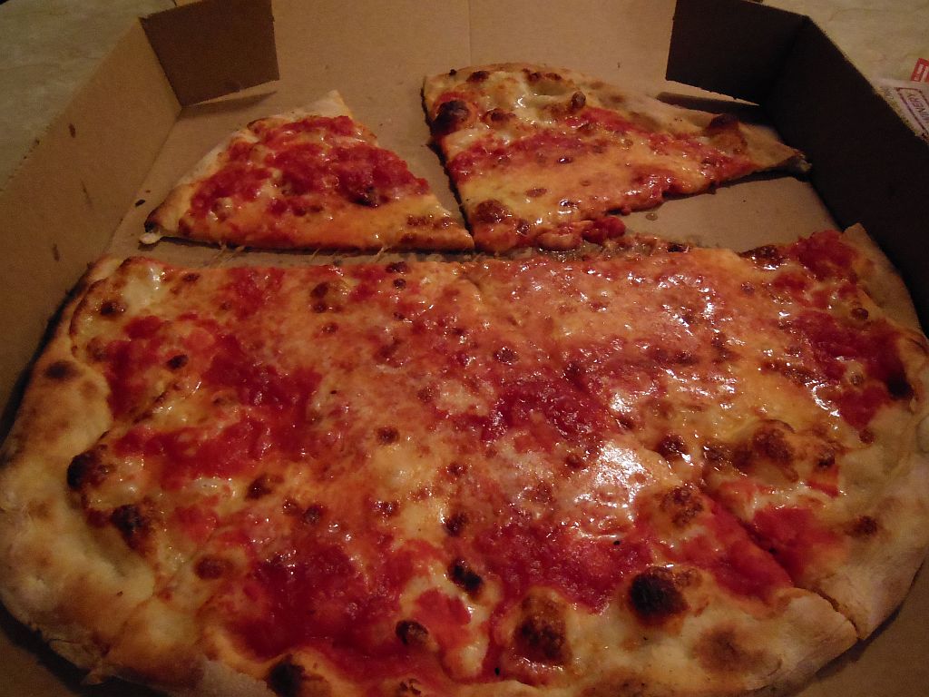 Looks aside, it was love at first bite–piping hot, chewy and delicious. I was blown away by both the lush and flavorful oil and the zesty sauce. The light cheese perfectly complimented the delightfully chewy coal-enhanced crust which was truly the star of the show. I managed to knock off three slices in no time flat taking the rest home for Mom and Dad.
