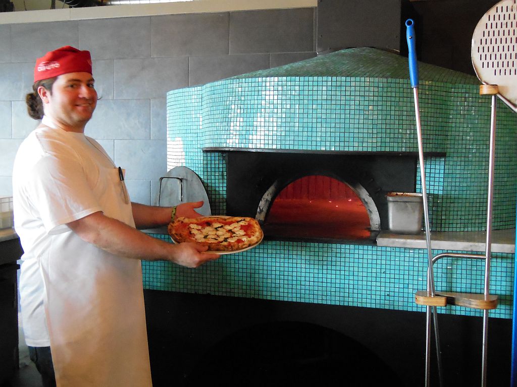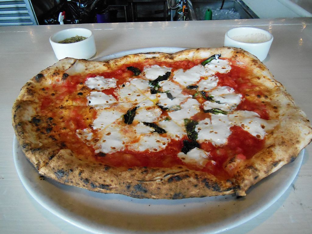We took seats at the bar with a good view of the wood-burning brick-oven which they had brick-stamped “2011.” I asked the barkeep which pie to get if I was just a “cheese and sauce” guy, and he suggested the Margherita. Since it was just snack time for us, we ordered the $12 one from the lunch menu, and it turned out to be just enough–three small slices for each of us.
