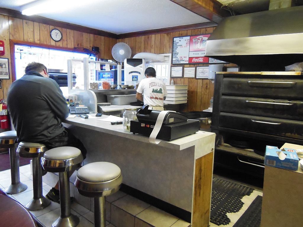 Dinner time was approaching, so I watched the three folk on duty busily handle a heavy volume of phone orders. One guy worked the kitchen in the back readying pizza dough plus any other non-pizza menu items (calzones, salads, sandwiches and a few Italian entrees). He also seemed to be the one getting the orders together for the delivery guy who must have been out on the road. Another guy sat at the counter in a track suit answering the phone and taking the orders. The busiest guy, though, was the cook who steadily worked making the pies.