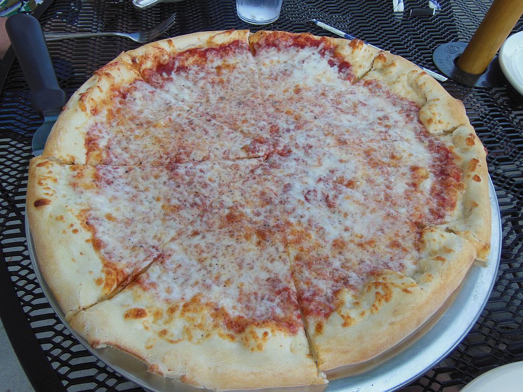 Like always, we kept things basic and ordered a couple of large 18-inch NY-Style pies from the top of the menu: one plain cheese ($13.99) and another with pepperoni. The lower half of the menu featured some specialty pies with Wall Street-themed names such as the “Black Friday,” “Bull Market,” and “Pork Futures.” Salads (ours were fair), calzones, and sandwiches were offered along with beer and wine.