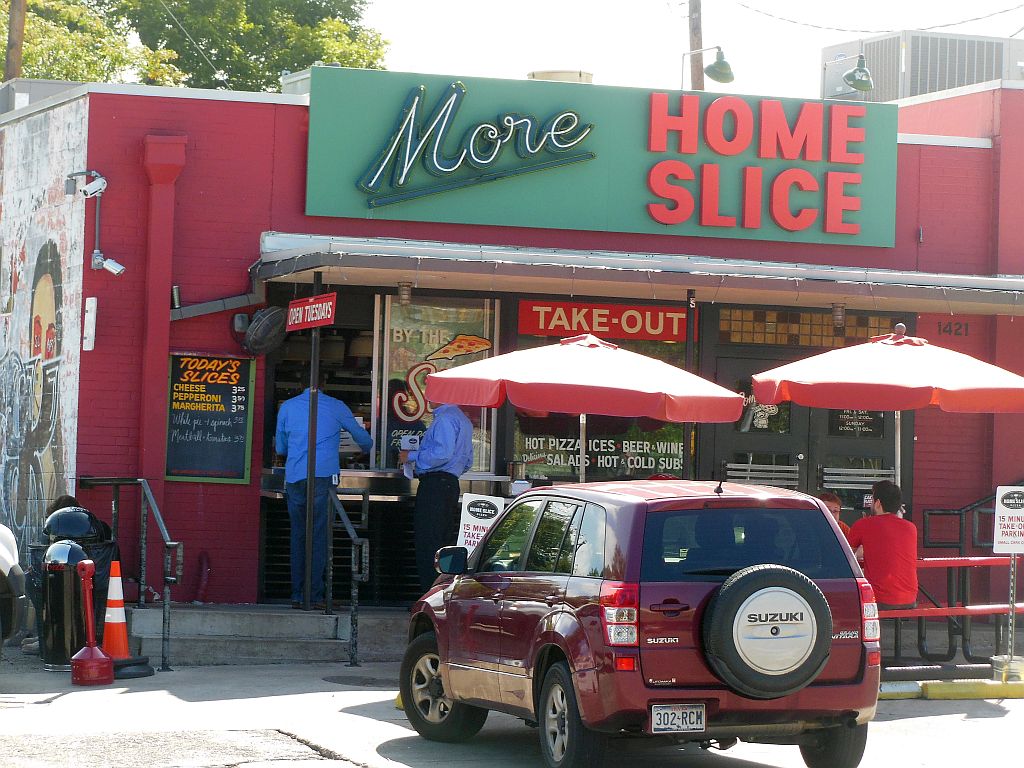 Driving through Austin for the first time in 15 years, my reminiscing was mostly “that’s where so-and-so used to be” rather than sighting old familiar places. I did find that the South Congress area was still an exciting part of town–full of local color with a steady stream of renovated neon-signed storefronts. Home Slice occupies a large space on the east side of the road. Arriving, I struggled with the unusual requirement to back in and park at an angle on South Congress.