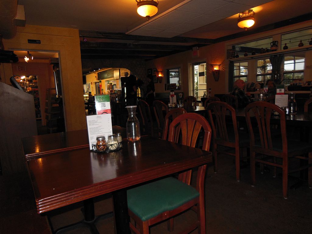Our salads were good and tasty, topped with a delicious Italian dressing. The pizza looked unique and enticing—notably thin with a charred crisp crust, much like a New Jersey bar pie. It was, however, awkwardly constructed with unevenly cut slices and varying widths to its end crust. In a strange way these minor flaws tended to give the pie a certain charm and character. It looked like a crispy, crunchy delight. Unfortunately, it seemed that the ends on top cooked much better than did the bottom. As often happens, this made the slices top heavy and hard to eat when you picked them up. It was somewhat manageable, but with toppings things may have gotten out-of-control. On top, the mozzarella cheese, tomato sauce, and olive oil were all fresh and tasty. These traditional ingredients all blended together just right to create a delicious tasting pizza. However, there were problems down below: The crust fell apart. In addition, the crust had a dry cracker-like taste and was not at all chewy. The good taste of what was on top did not make up for the problematic crust underneath. This very promising-looking pie turned out to be a little disappointing.