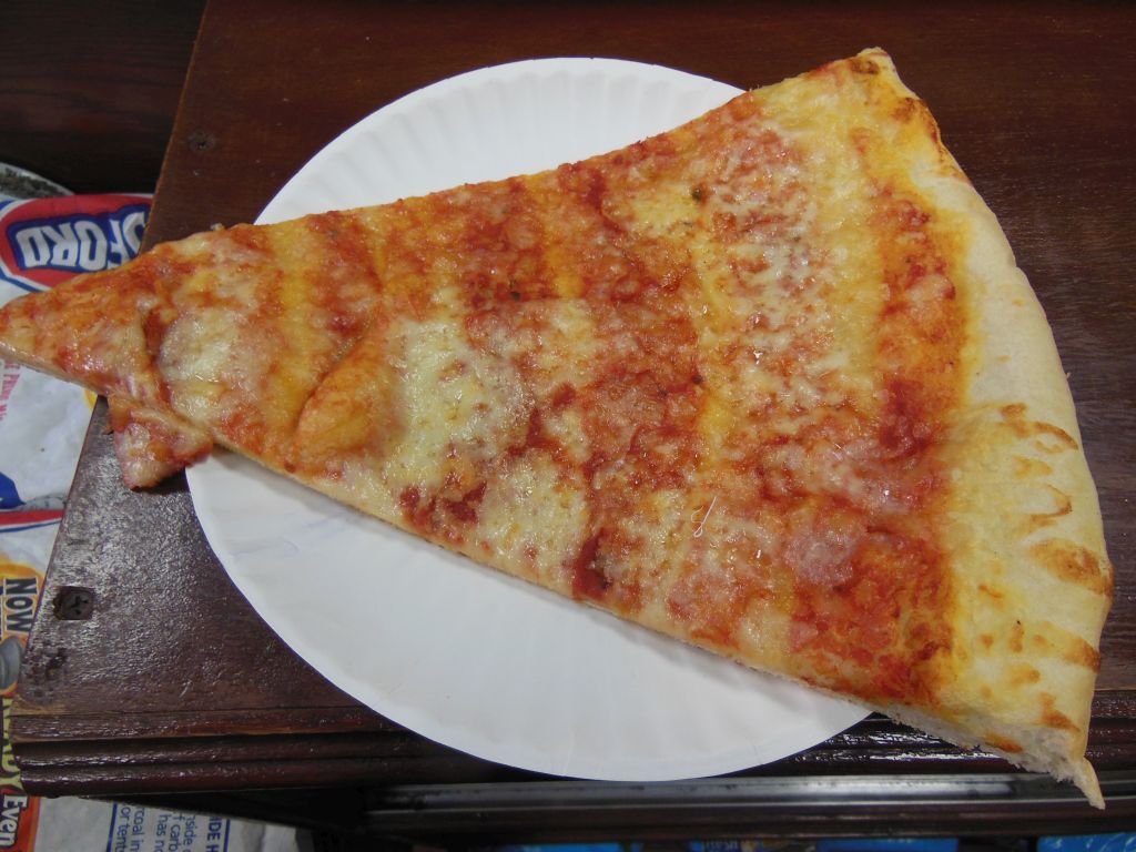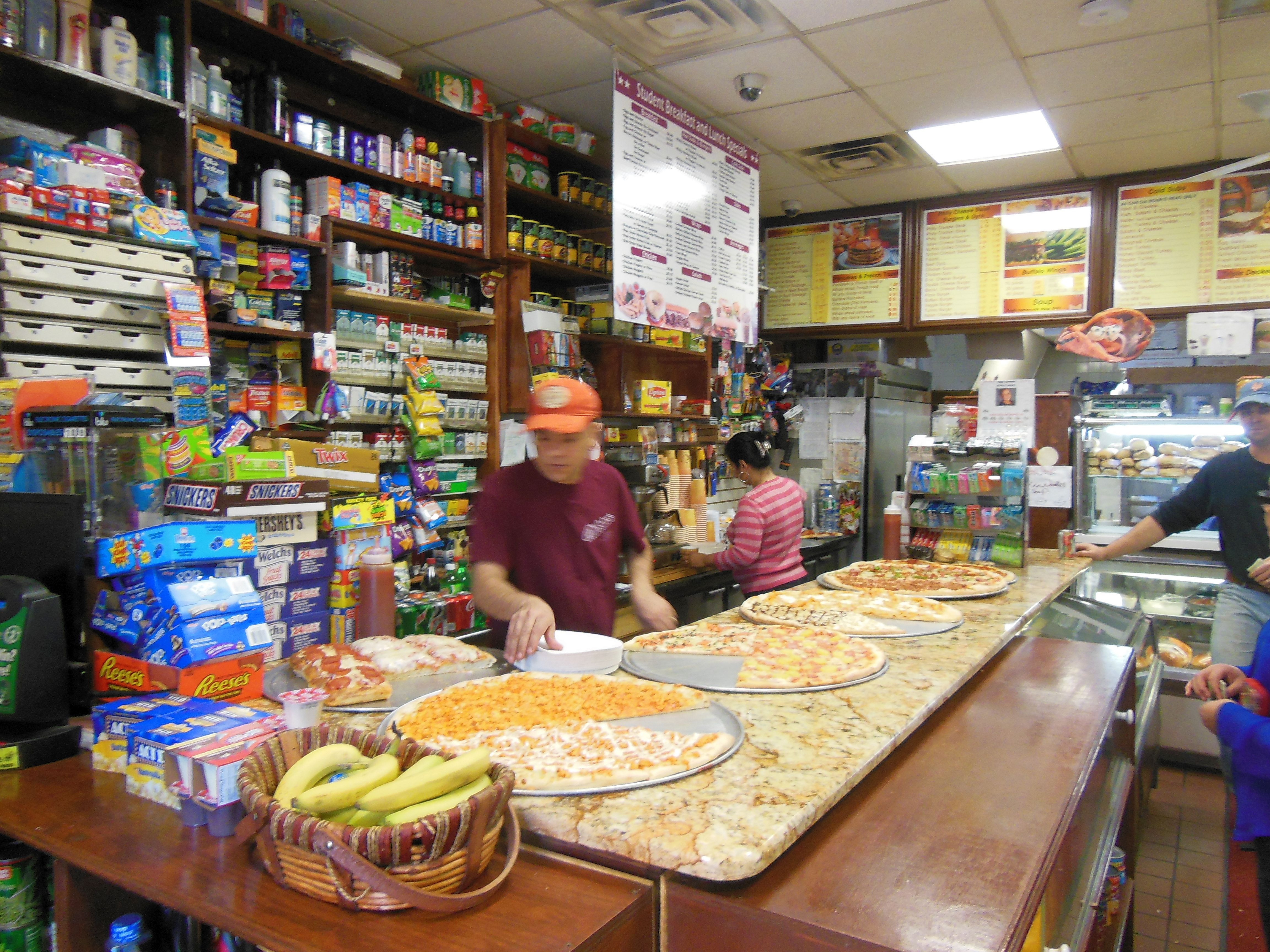 When I walked through the door my eyes lit up:  It was pizza time at the grocery store! There inside this typical stuffed-shelf corner store they were fully geared up for school lunch time. Atop what would normally be the checkout counter were four different types of giant pizzas (plus some Sicilian slabs) cut into slices laid in pans across a slab of granite. I ordered a big cheese slice which was a fab bargain for only $2.00 cash including Governor Christie’s cut. With nowhere to sit inside, I took mine for a walk back to my car while many of the students ate theirs around the corner leaning against the building.