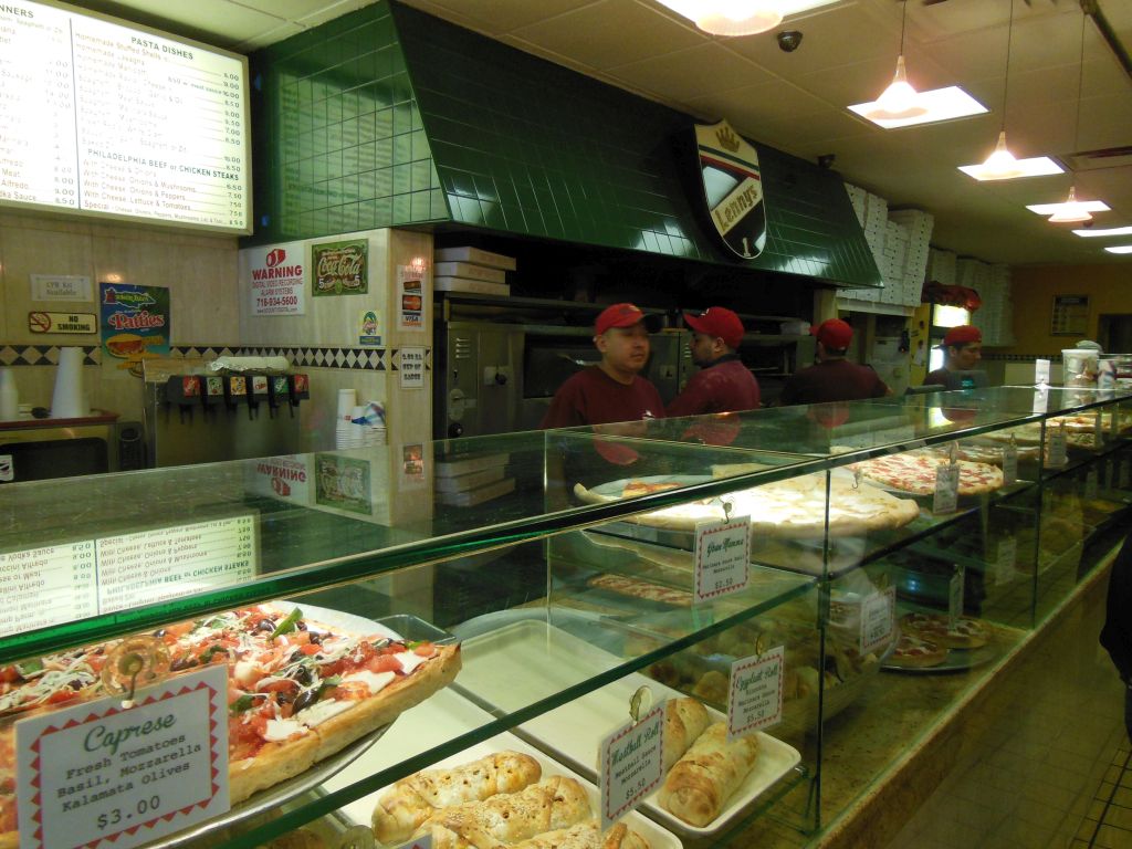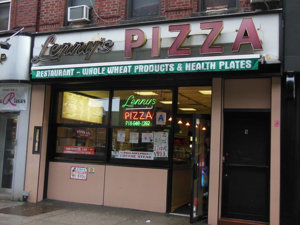 Lenny’s has been around since 1953 and is your typical East Coast pizza place offering and delivering the usual quick Italian wares (hot and cold heroes, pasta, and salads). The counter sported two layers of specialty slices under glass. Something that you didn’t see at the time of the movie was their awning trendily boasting “Whole Wheat Products and Health Plates.”