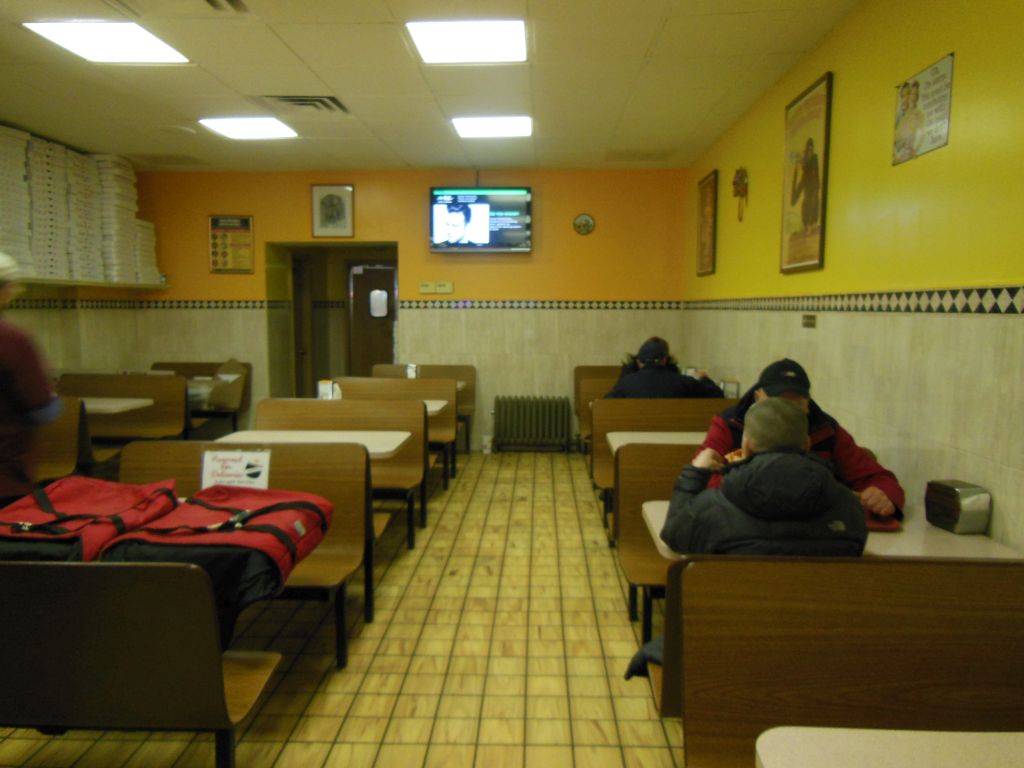 Not in a “double-decking” mood, we each ordered a single slice ($2.25) at the counter from the wait staff who all strangely wore red Cincinnati Reds baseball caps. Across from the counter, there it was as I expected—a picture of Travolta. A quick reheat of our slices, and we retreated to a table in the back.