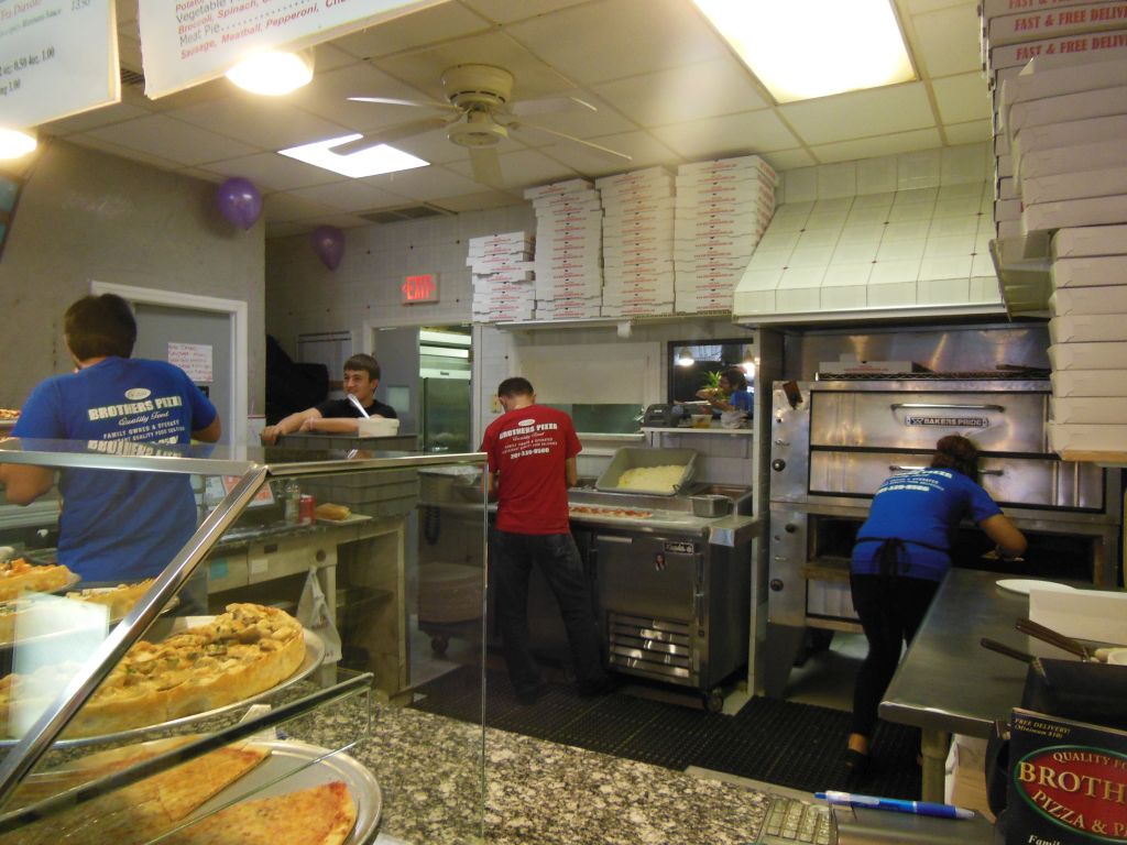 Entering the small joint, I made my way through a packed house of young children celebrating a birthday party. Getting to the counter, I ordered the requisite $2.00 plain cheese slice while succumbing to the fact that there would be nowhere inside for me to eat it! Aside from the facts that their room is small and that there is no counter space from which to scarf a slice, Brothers looked to be the usual generic Jersey pizza joint. They offered specialty slices and the usual things you would expect from a place like this. They do stretch out a bit in the pizza department by also offering pan and stuffed varieties.