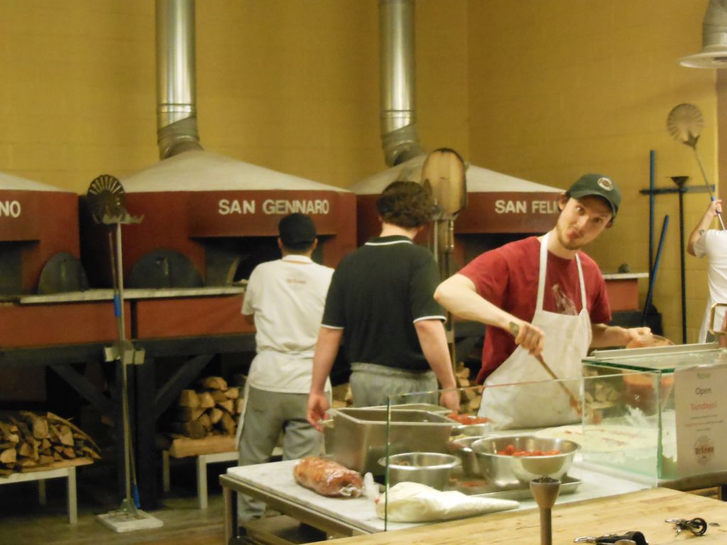 I ordered a small Margherita pie for $12, took my number (a pizzeria first for the Snob), and grabbed a seat at an empty table where I witnessed the family-friendly appeal of the place. At this hour there seemed to be a lot of children there enjoying the experience of seeing their pizza prepared in the open room. My number was soon up, and my pie came quickly. Cut into eight small slices, it came served on a silver cafeteria-style tray.