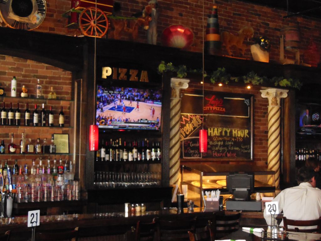 I invited a few of my work buddies for lunch to give Luigi’s a try. Having to pay for parking downtown is always a drag, but we managed it with just a few bucks and a short walk. Inside, we found Luigi’s to have a lively barroom atmosphere, learning that the place is merely an extension of the Tequila Cowboy nightclub around the corner. It was built as a place for late night partiers to munch out! Luigi’s featured a first for me, small television screens at each booth. The booths were in the center of the music-themed room flanked by a long bar on one side and tables on the other. There was also a stage in the corner.