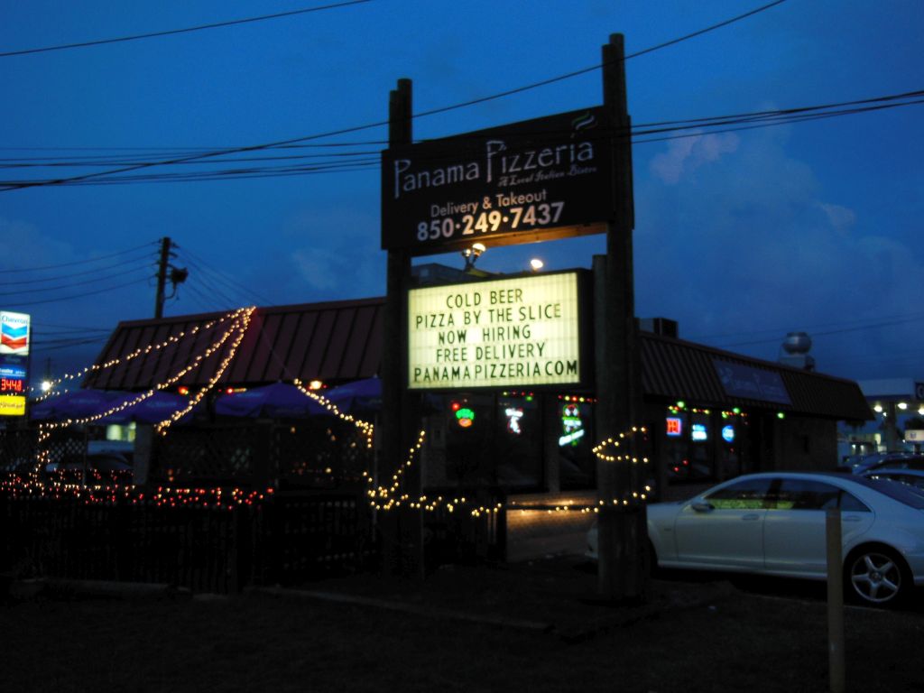 Riding along the beach road, my eyes spotted a large sign saying “Pizza by the Slice” atop a local-looking joint called Panama Pizzeria. It was fairly close to Pier Park so I dropped Mrs. Pie off and headed back for a quick slice rather than taking my usual nap in the car while she shopped.