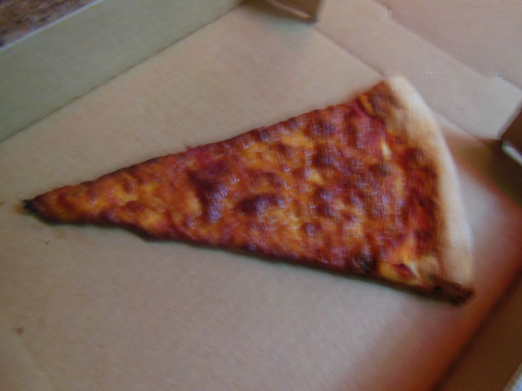 As time moved on, I had no luck whatsoever in getting Pizza Dude’s attention about my forgotten slice. I figured that he would at least see the lone slice when he was going in and out of the oven, but I had no such luck. Finally some twenty minutes later he somehow remembered my long lost slice. He then made one of the worst decisions in food-serving history and served me this past due slice inside a small pizza box.