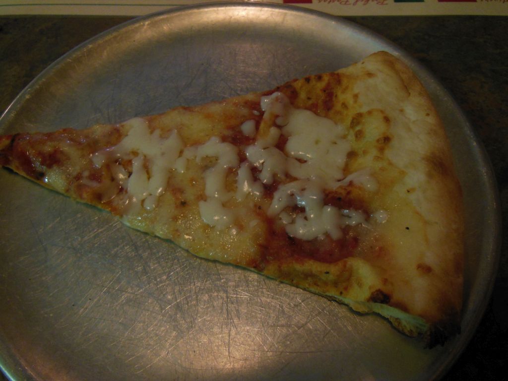 After a short wait during which The Philosopher nursed his beer, my slice came on a small silver platter. There was a healthy smattering of “test cheese” on top revealing that they wanted to reheat it just right. They did just that since the slice was toasted good and crisp throughout. A nice flavorful touch of oil atop the nice thin slice started to make me forget my earlier disappointing experience a few blocks away.