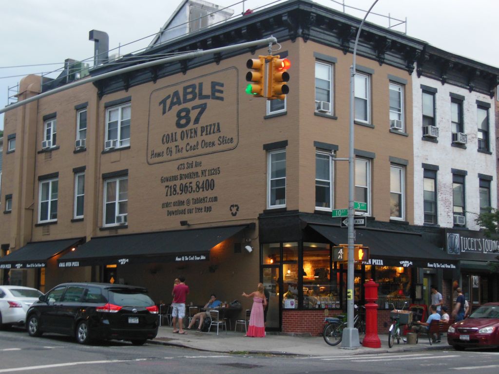 Brooklyn is an awfully big island. Even after all of the times I’ve been there, I still don’t have a good sense of where things are. My alter-blogger Music City Mike ventured to its Gowanus section earlier this year for some live music at the Bell House. In need of a rest stop after parking the car, I thought I hit pay dirt when I spotted a large sign painted on the side of a building that said “Table 87: Home of the Coal Oven Slice.”