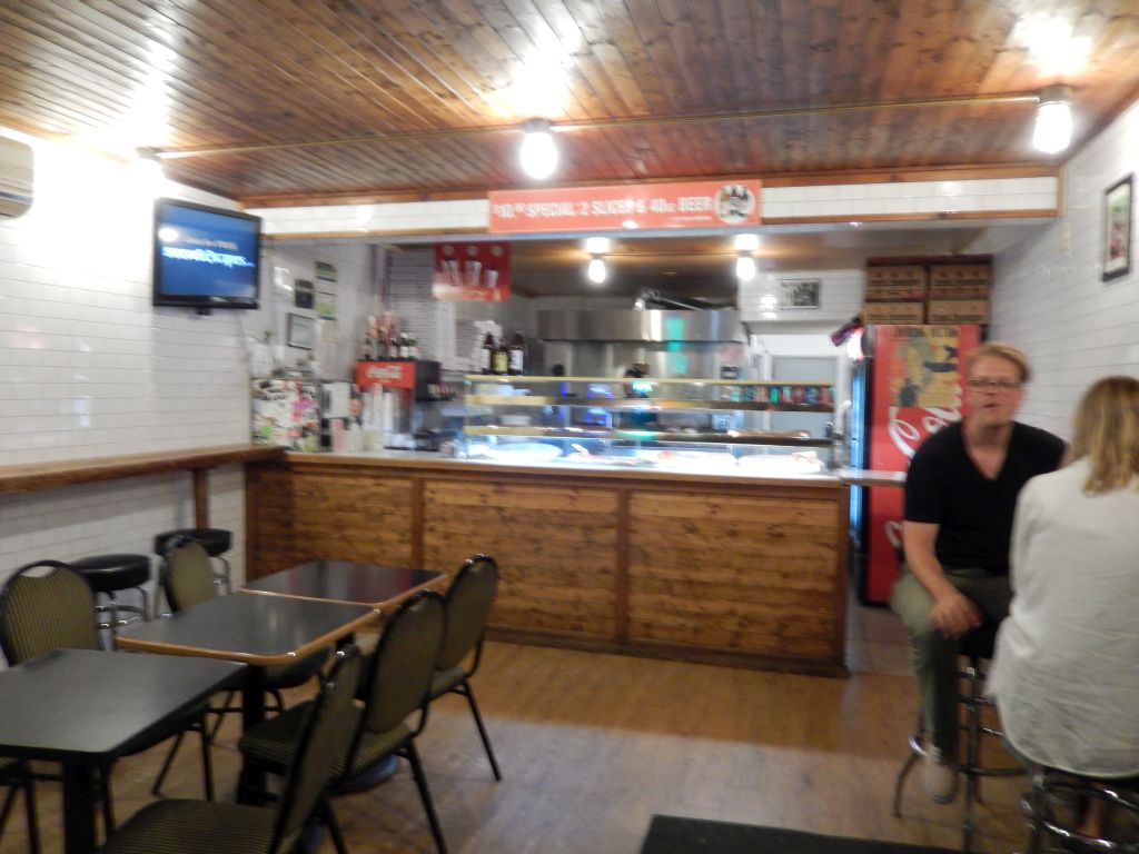 Peeking through Fiore’s open air façade, I spotted delivery activity behind the counter and a handful of patrons in the square front dining area. In the rear was perhaps the biggest pizza oven I had even seen—a massive machine against the back wall! I found that Fiore’s sells pizza, calzone, rolls and salad with beers available to wash them down.