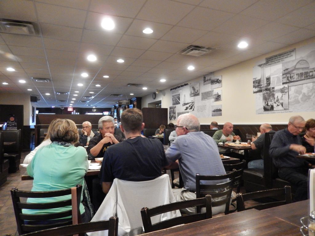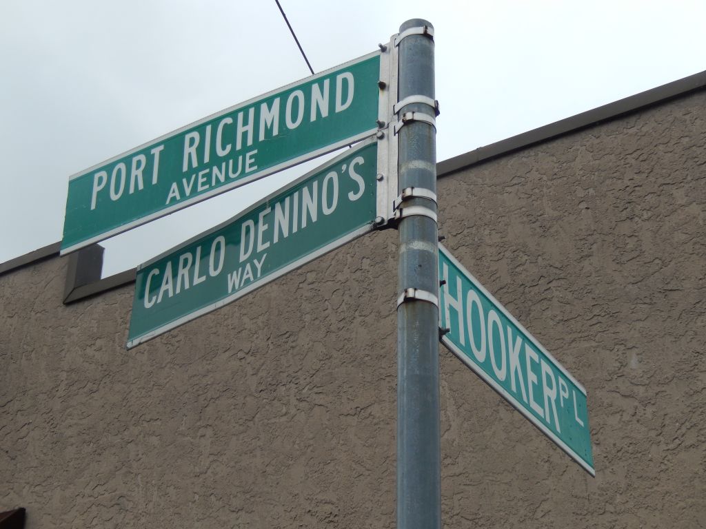 After crossing over the bridge (currently under renovation to raise the roadway for large container ships), I found Denino’s just a few blocks off the first exit in a small commercial district. Facing the street were both its original bar entrance and another newer one to the dining room. A police vehicle was parked in front despite the fire hydrant. I was immediately impressed to notice that the corner had an honorary street sign for “Carlo Deninio’s Way” similar to one I had seen at Lee’s Tavern.