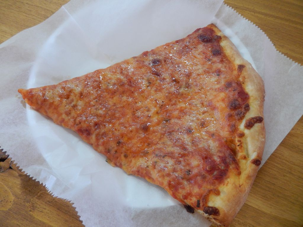 Peppinos - outside - RESIZEI made Peppinos my first stop and walked in to find the same setup as Pizza Nona: pizza to the left and ice cream to the right. On top of the pizza counter under glass was a freshly made plain cheese pie with just one slice missing—assumed sold to the day’s first customer sitting out on the deck. I ordered one of these very promising-looking slices for myself ($3.50) and waited inside at a table during its brief reheat.