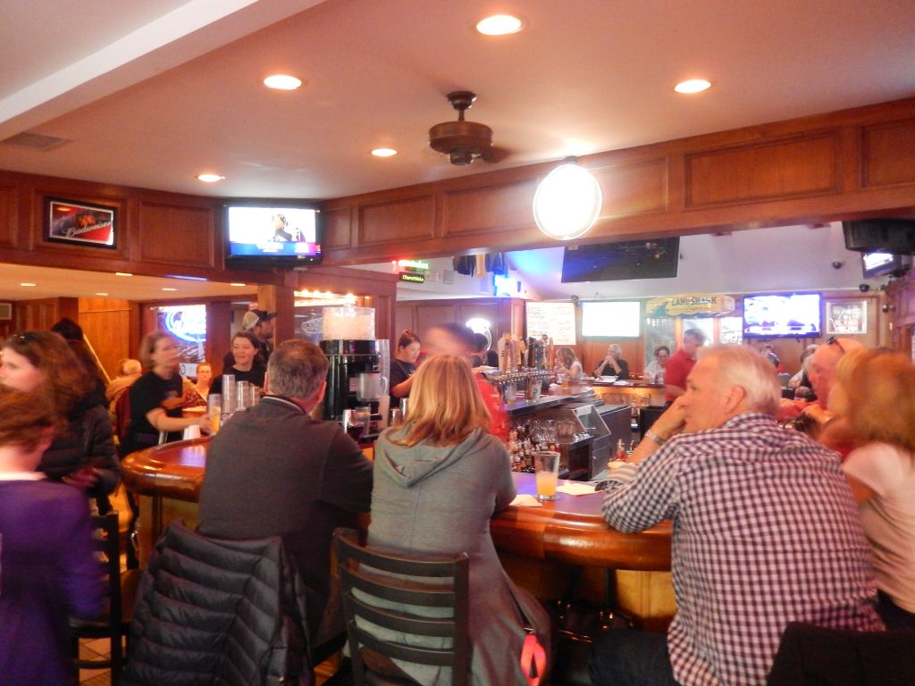As soon as I was seated, I was quickly greeted by my waitress and ordered a “large” (their middle size) plain cheese pizza for $12.25. I also inquired about the two names. Story goes they were once separate businesses, and the pizza people bought out the bar people when they retired. The building is now one long stretch, but the former separation point is still apparent.