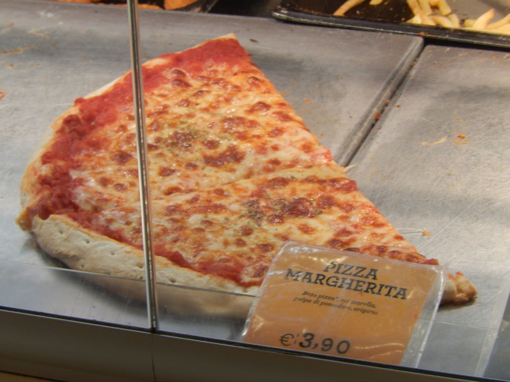 Inside the rather large facility, I found the pizza section and spotted some rather large Margherita slices under glass at the counter that sold for €3.90. In true concession fashion, I would also have to first struggle with some horribly slow service to get my slice. This just about drove Mrs. Pie nuts since she was ready to get back to our tour. Their process was the usual fast-serve Italian method of paying at the register and then bringing your receipt to the serving end of the counter. Since the lady on duty felt that cleaning the area behind the counter was more important than serving customers, the other dude on call was doing both duties. His method of operation was to first collect Euros from a few customers at a time and then move to the service area to dish out the pizza.