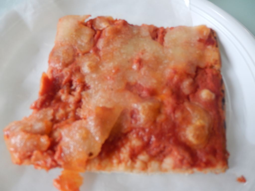 My slice (or more like a slab) was billed as a Margherita since it was just cheese and sauce. It was served cold (I was not asked if I wanted it heated) and cost only €2.00. The best way to describe this slice was that it reminded me of a cold leftover slice of Sicilian pizza that you ate right out of the refrigerator. It had the same texture of being bread-like on the bottom with the full layer of Mozzarella cheese and unseasoned tomato sauce on top.