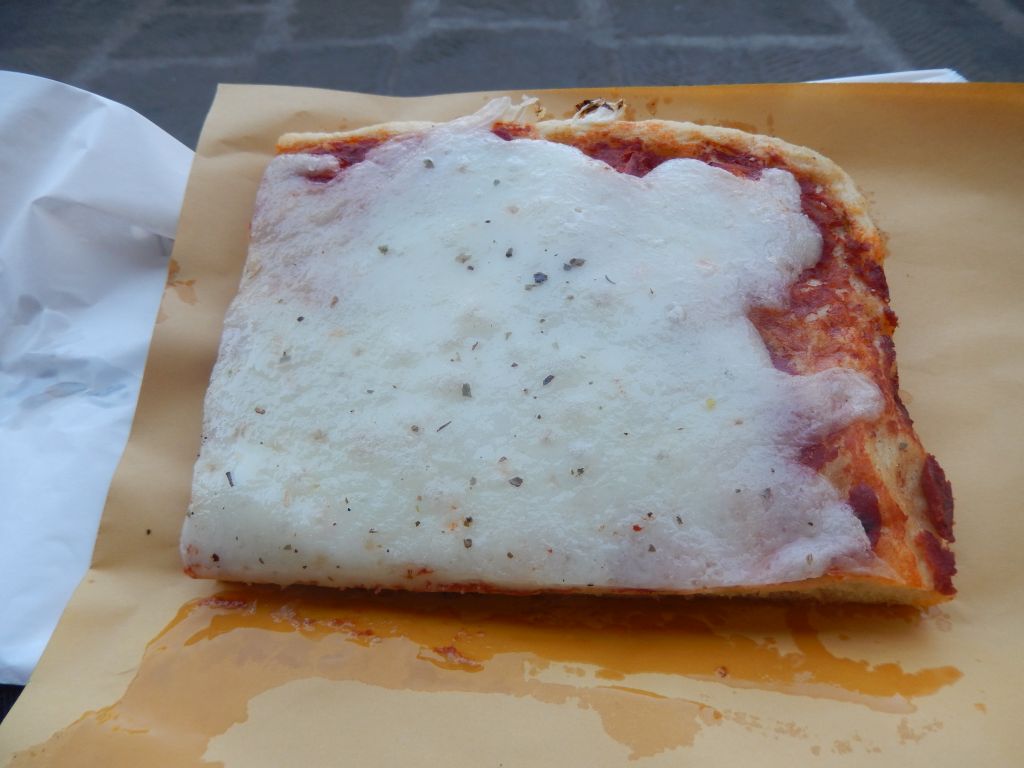 My slice would best be described in American terms as a Sicilian. It had a thick, but crisp, bread-like base and a full layer of cheese atop the tomato sauce.